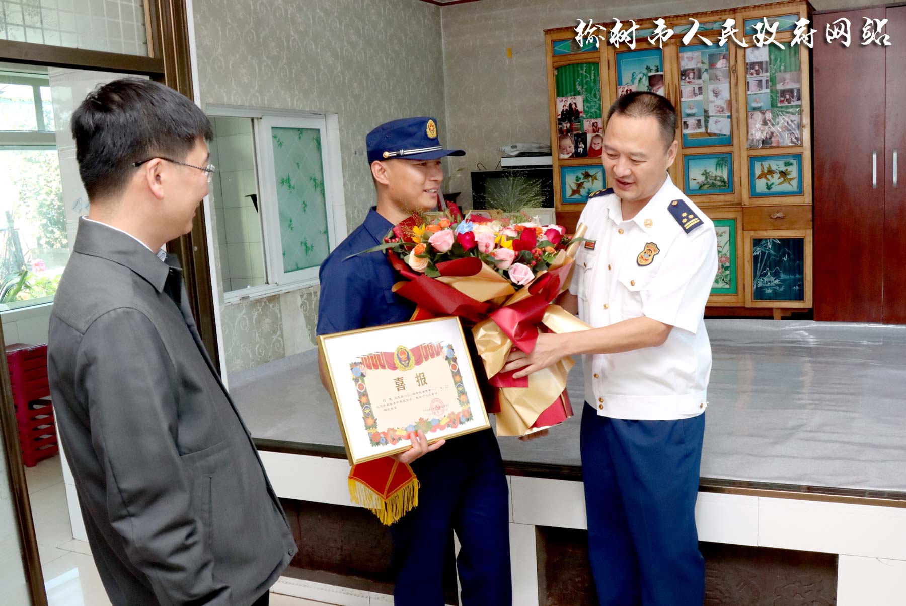 为充分发挥先进典型榜样引领作用,切实增强消防救援人员的队伍归属感、职业认同感和荣誉获得感,激励全体指战员崇尚荣誉、珍惜荣誉,9月2日下午,长春市消防救援支队政委葛长荣、副支队长申劲松在榆树市消防救援大队、长春市宽城区消防救援大队领导的陪同下,为荣立个人三等功的消防员刘龙送喜报到家。榆树市委副书记、市长吴威,市委常委、常务副市长孙宏宽参加相关活动。