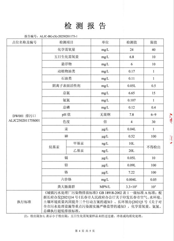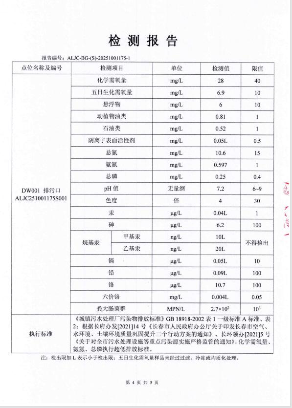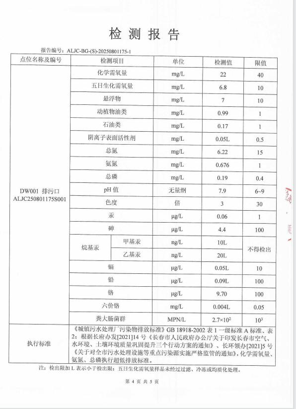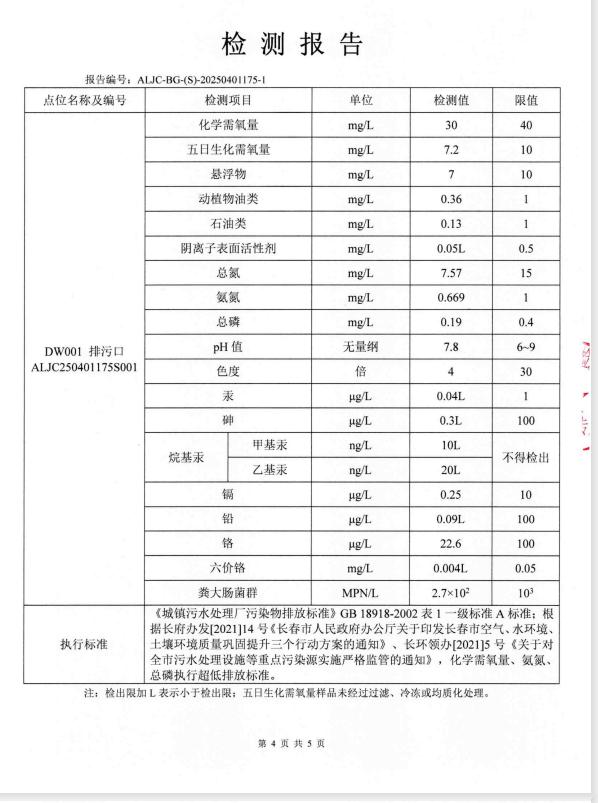 4、出水水质自动监测各项数据时时上传,厂内化验室每日手工化验COD、氨氮、总磷、总氮、PH、悬浮物6项主要指标;委托三方检测项目COD、BOD、PH、总磷、色度、悬浮物、氨氮、总镉、总铬、六价铬、总砷、总铅、总汞、粪大肠菌群数、总氮、石油类、动植物油类、阴离子表面活性剂、甲基汞、乙基汞20项,每月上传;污泥监测每季上传;噪声、废气监测每季上传,以上所有监测数据上传至吉林省环保厅官方网站的国家重点监控企业数据信息公开平台公布。