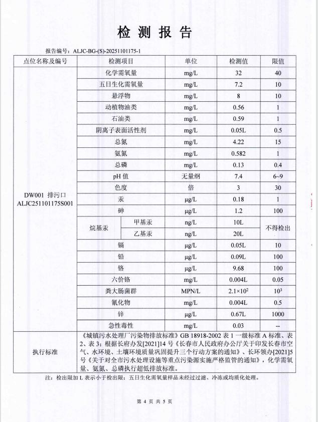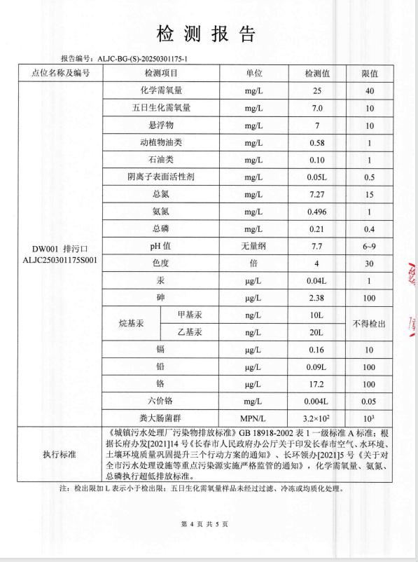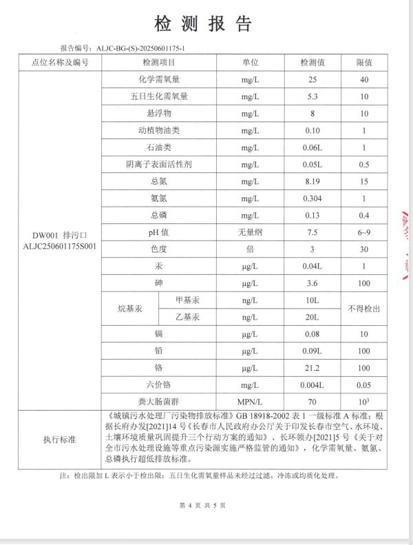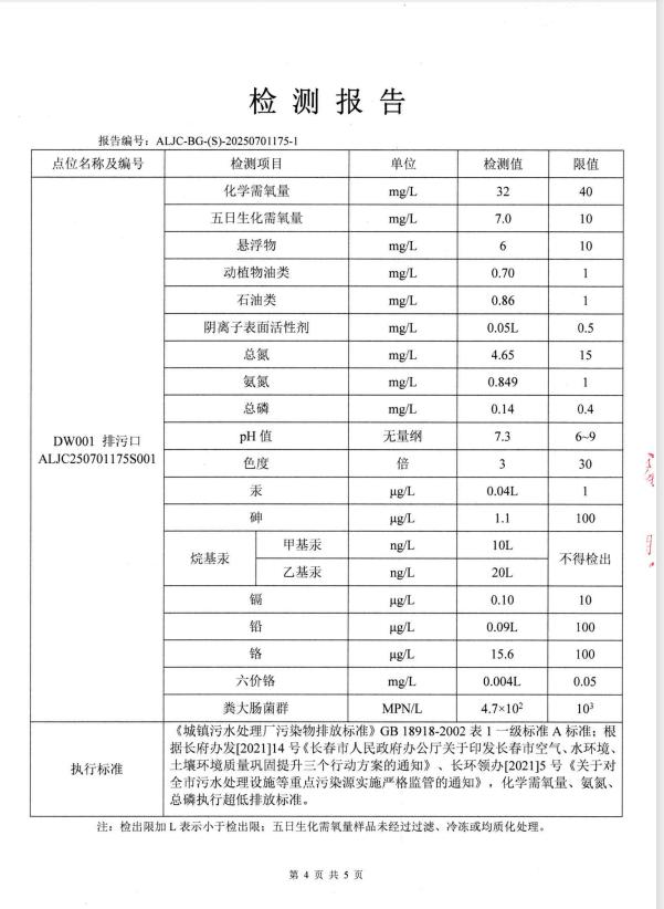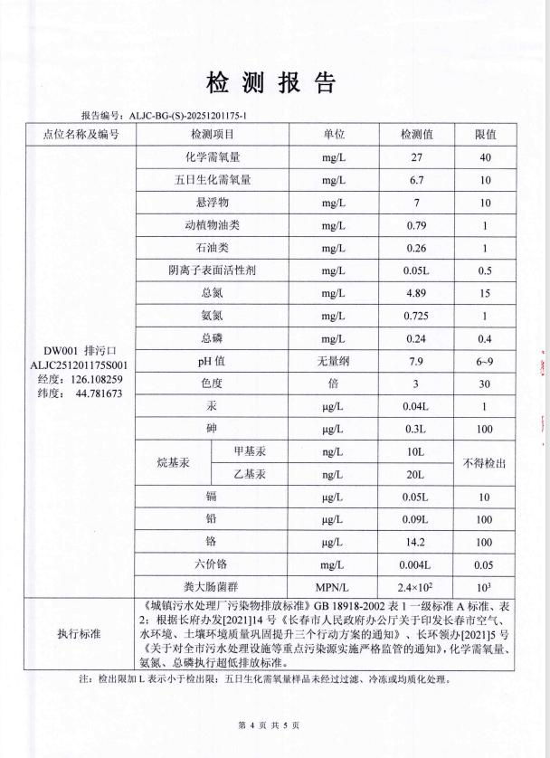 2、2025年1月1日至2025年12月31日,累计处理污水821.8076万吨,其中COD平均出水为27.3mg/L;氨氮平均出水为0.27mg/L;总磷平均出水为0.14mg/L;总氮平均出水为7.68mg/L,各项出水指标稳定,完全达到国家规定的一级A排放标准。